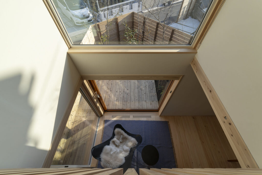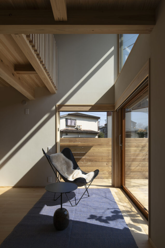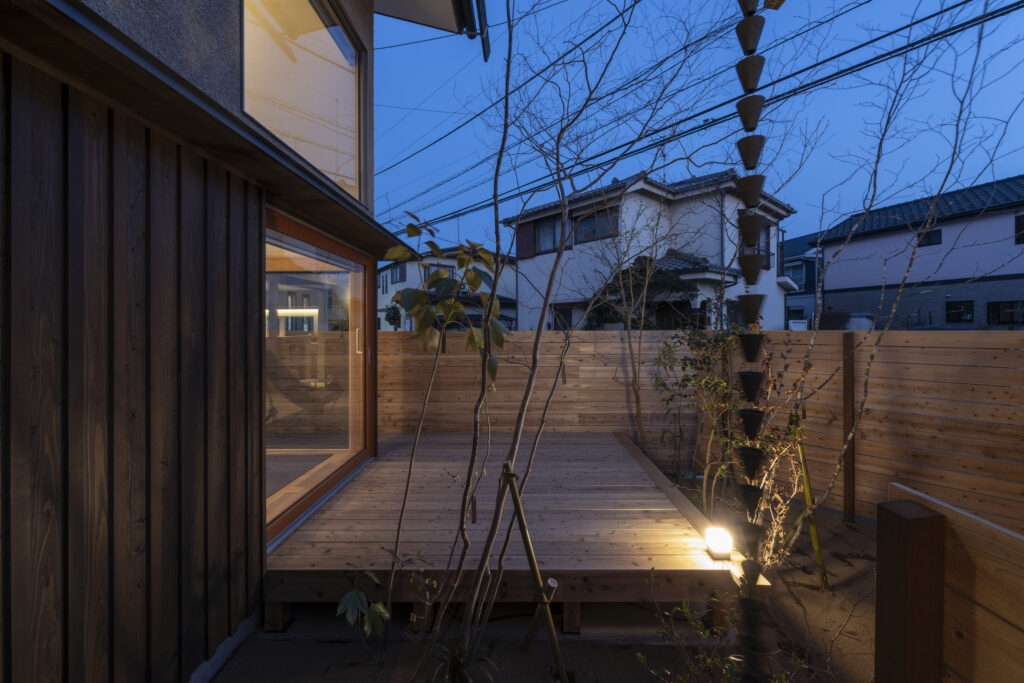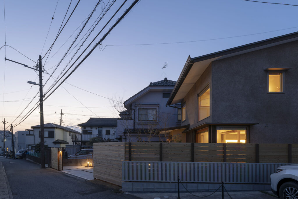 北・東・西と蜜に住宅で囲まれた縦長の敷地。敷地固有の抜け感をどのように家の中に取り込み関係性を構築するかが課題となりました。南側道路が斜めに走り、そのため東側の家がこの家より北にセットバックして建っています。そのおかげで南東も条件がよいと判断し建物に反映しました。庭を五角形に塀で囲む事により奥行を出し、敷地と建物の関係に変化をつけました。これが特徴的に面白味を出していると思います。